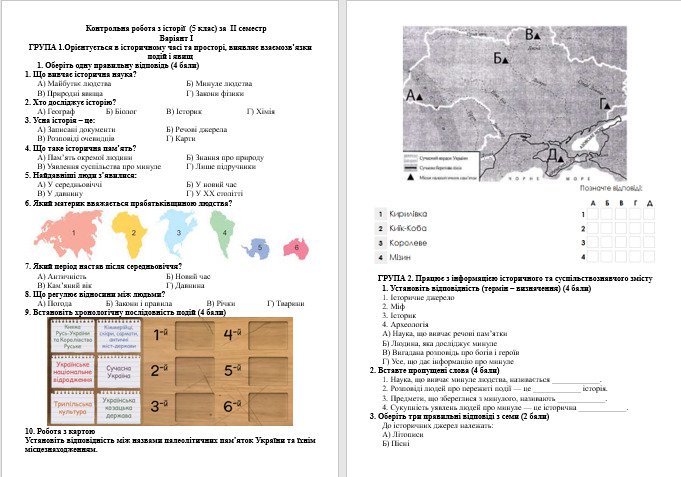 Контрольна робота з історії 5 клас Щупак за ІІ семестр (містить два варіанти)