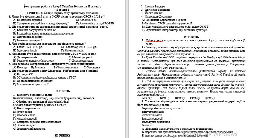 Контрольна робота з історії України 10 клас за ІІ семестр