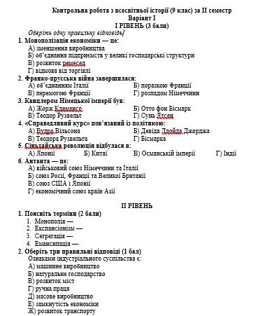 Контрольна робота з з всесвітньої історії 9 клас за ІІ семестр