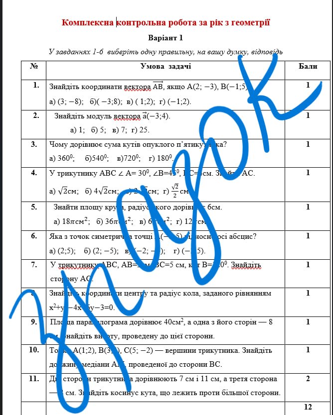 Контрольна робота за рік з геометрії 9 клас з відповідями