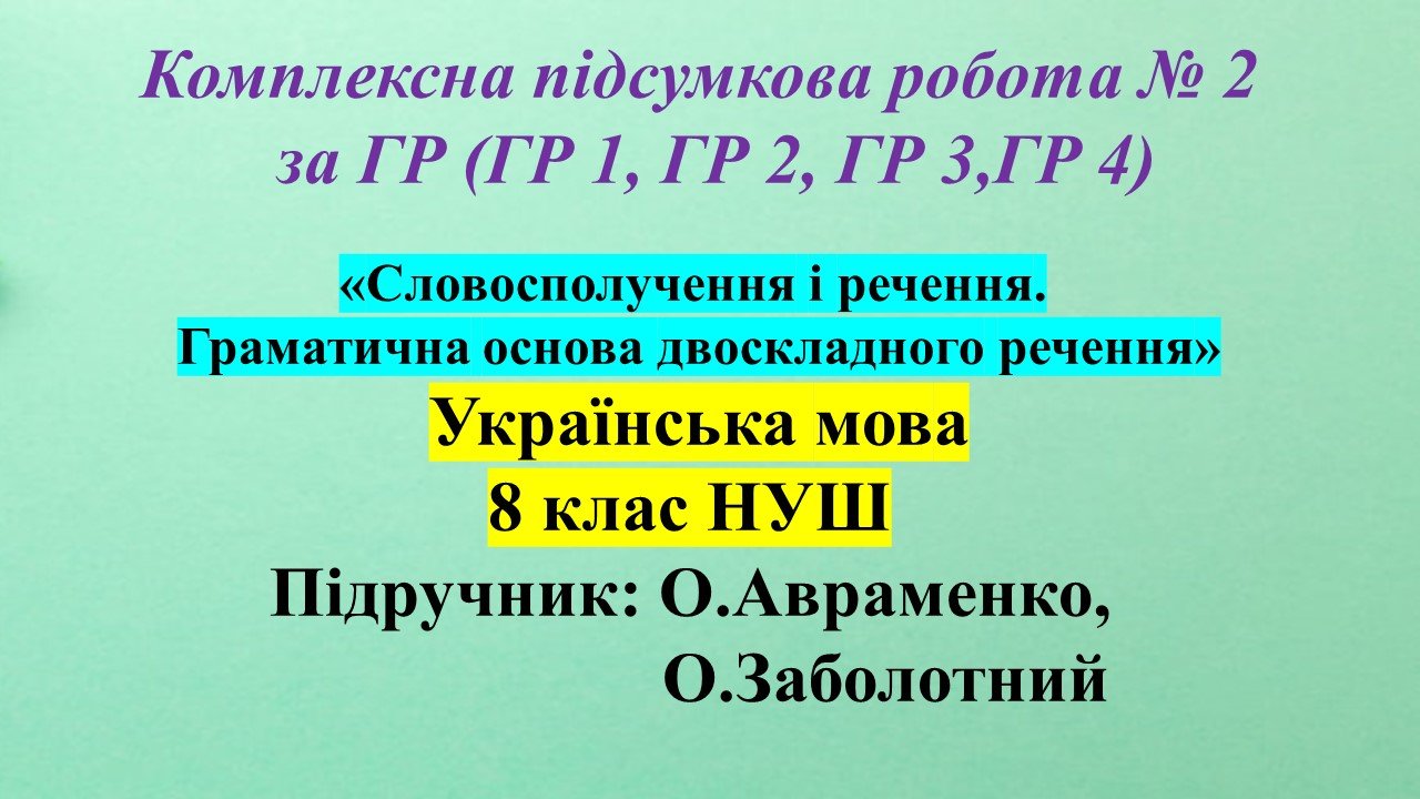 Комплексна підсумкова робота за ГР (8 клас НУШ, з української мови) з теми: «Словосполучення і речення. Граматична основа двоскладного речення» за МНП О.Заболотний.