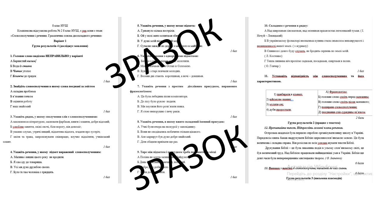 КПР ГР1, ГР 2, ГР 3, ГР 4, 8 клас НУШ, з укр мови з теми: «Словосполучення і речення. Граматична основа двоскладного речення»