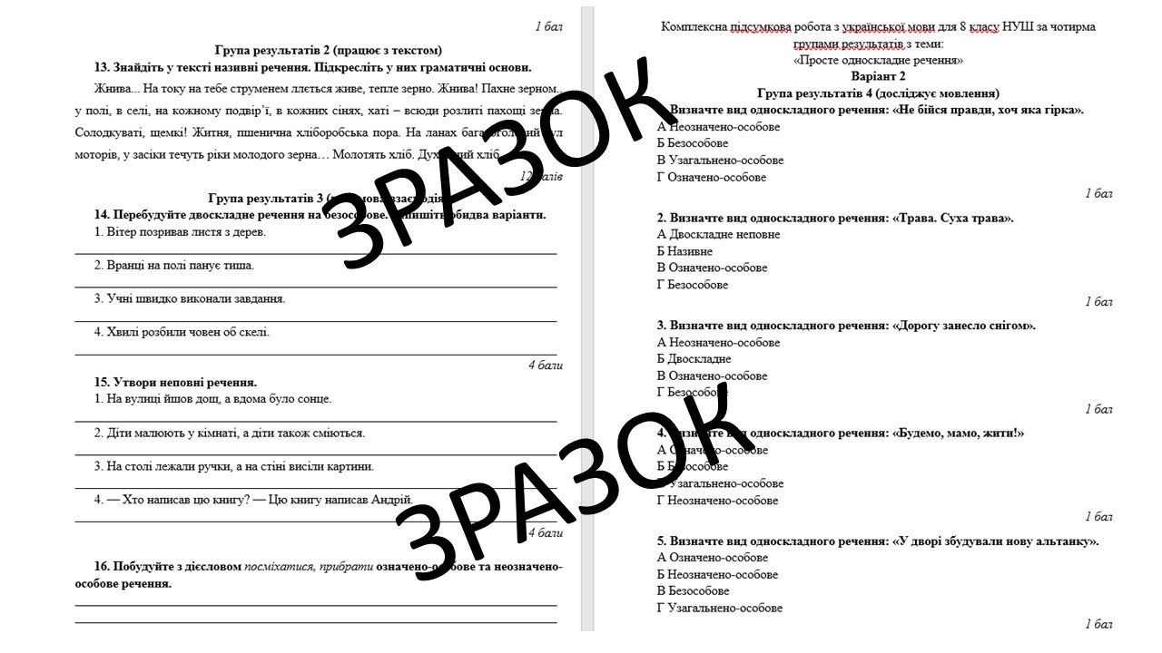 Комплексна підсумкова робота з української мови для 8 класу НУШ за чотирма групами результатів з теми: «Просте односкладне речення. Повне та неповне речення».