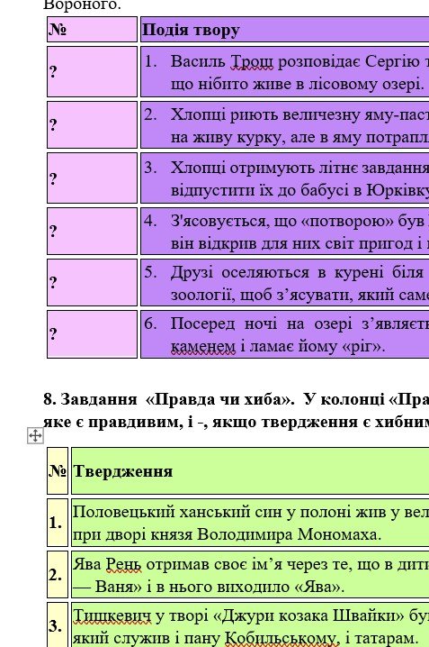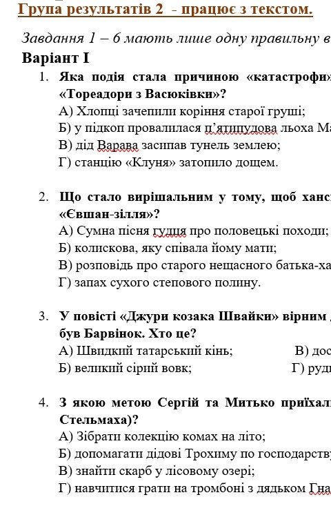 - ГР 2 – тестові завдання за змістом прочитаних творів, завдання на встановлення відповідностей, завдання “Правда чи хиба” – 2 варіанти;