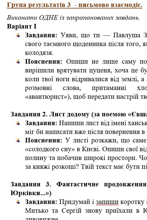 - ГР 3 – ТРИ завдання на вибір для написання творчих робіт різних жанрів, пов’язаних за змістом з прочитаними творами – 2 варіанти;