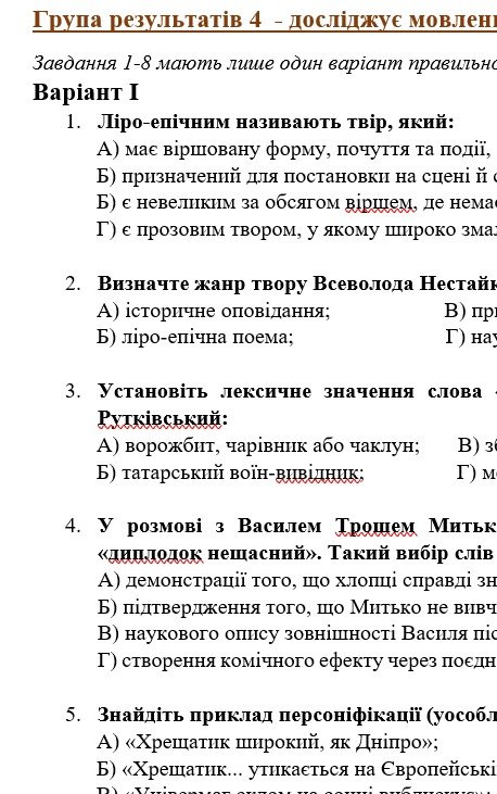 - ГР 4 – тестові завдання з теорії літератури, на дослідження мовлення, за змістом прочитаних творів, завдання на встановлення відповідностей, три завдання на вибір для короткої відкритої відповіді, творче завдання (асоціативний ключ) – 2 варіанти.