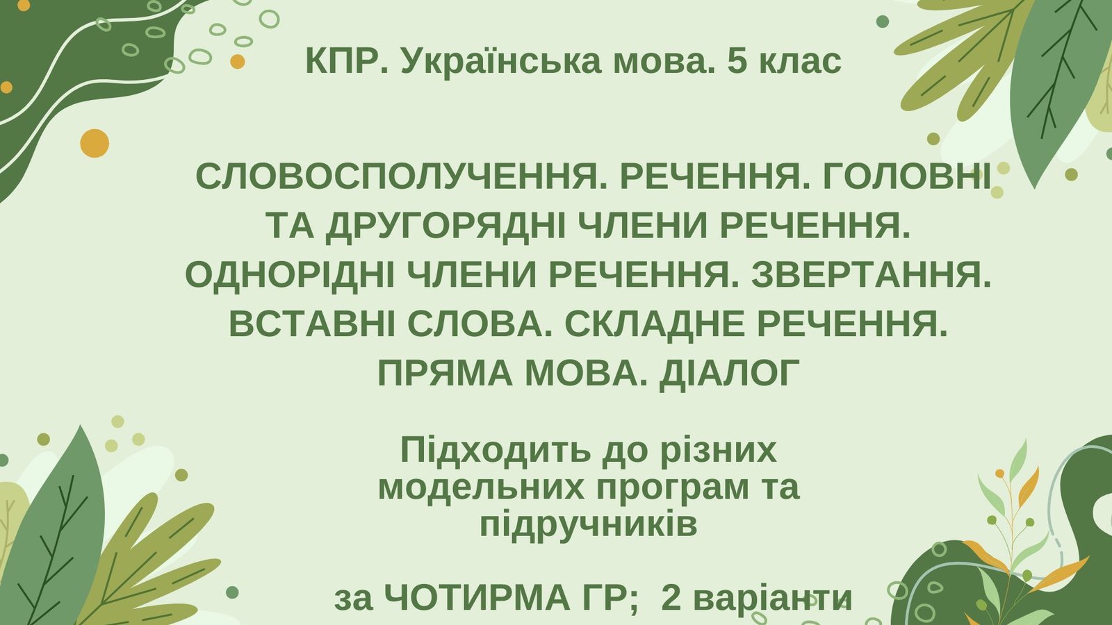 КПР. Укр. мова. 5 клас. “Синтаксис і пунктуація” (словоспол., речення, гол. та другоряд. ЧР, ОЧР, звертання, вст.слова, скл.реч., пряма мова, діалог