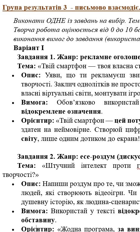 - ГР 3 – ТРИ завдання на вибір учня/учениці (написання творчих робіт на запропоновану тематику, пов’язану з текстами в ГР 2) – 2 варіанти;
