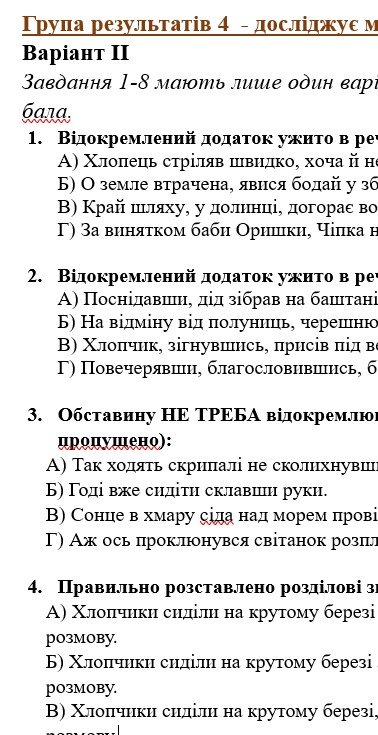 - ГР 4 – тестові завдання, запитання до короткого тексту, завдання на відповідності, робота з реченнями – 2 варіанти.