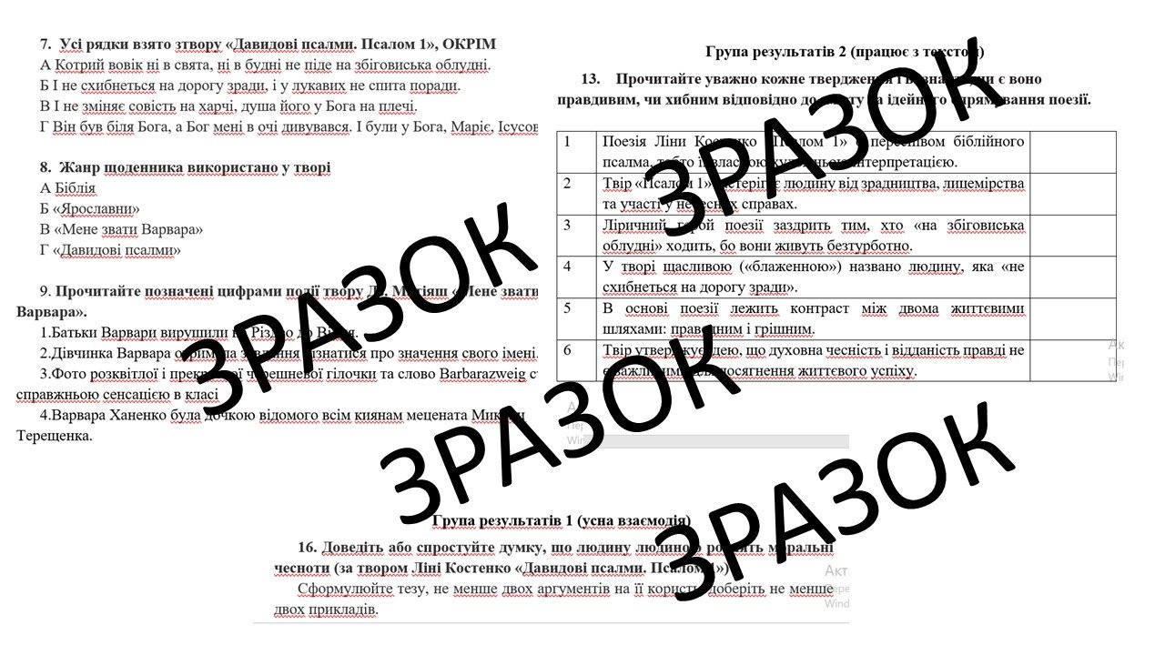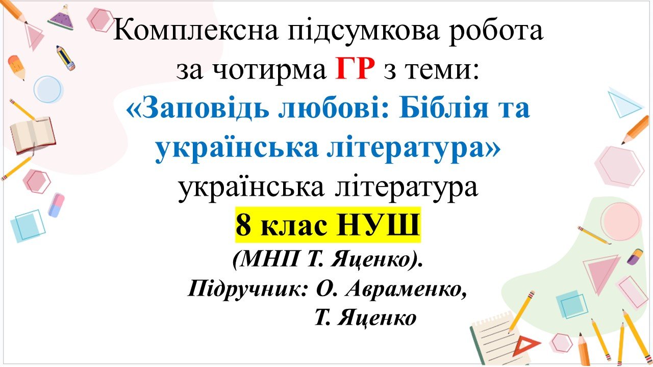 Комплексна підсумкова робота з української літератури для 8 класу “Заповідь любові: Біблія та українська література” за ЧОТИРМА групами результатів за модельною навчальною програмою Яценко. Підручник: Авраменко О.