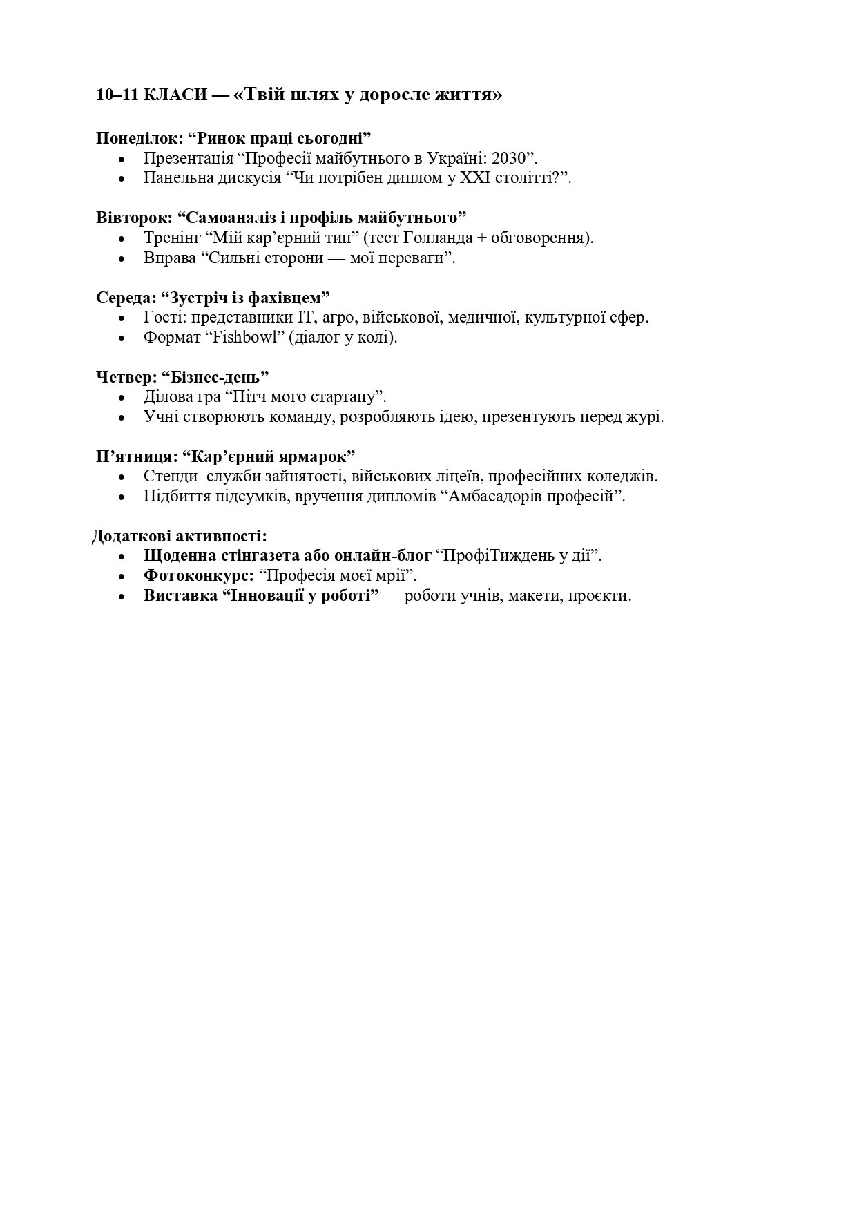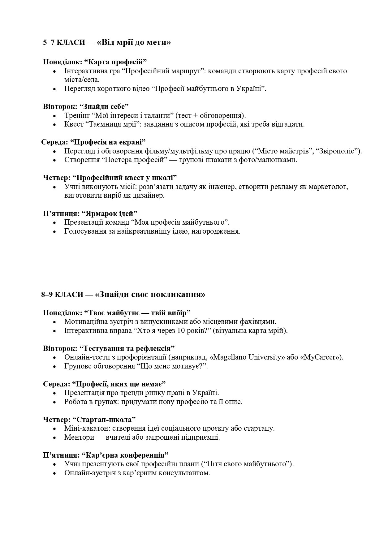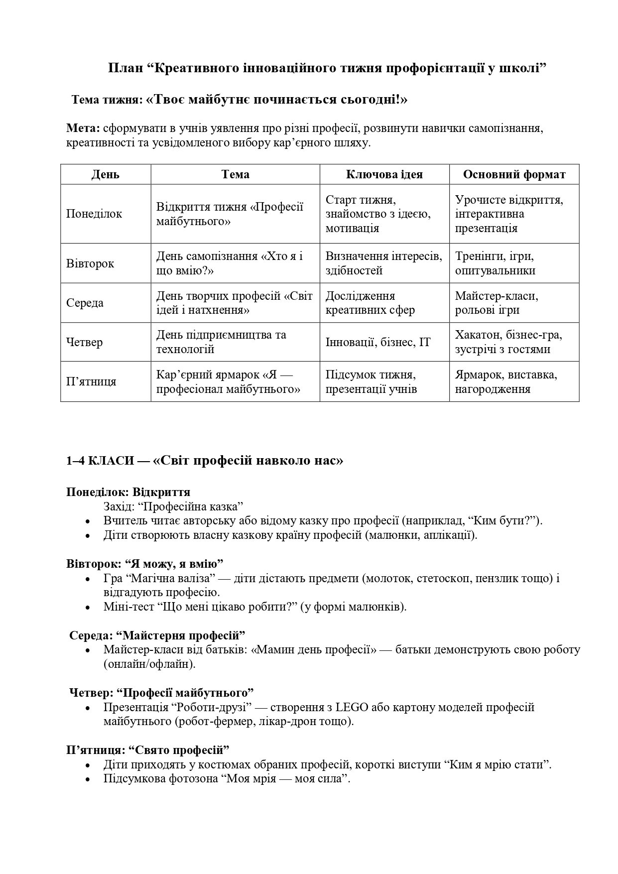Детальний план “Креативного інноваційного тижня профорієнтації у школі” з готовими сценаріями заходів, розподіленими за віковими категоріями (1–4, 5–7, 8–9, 10–11 класи).