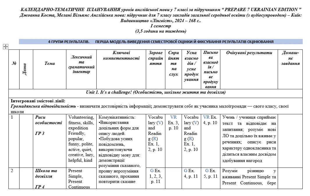 8 КЛАС. НУШ. КАЛЕНДАРНО-ТЕМАТИЧНЕ ПЛАНУВАННЯ З АНГЛІЙСЬКОЇ МОВИ. КАРПЮК. 2025-2026 н. р. І СЕМЕСТ...