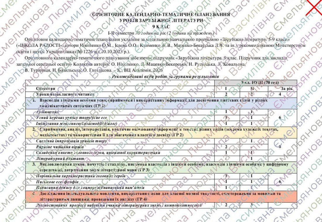 Орієнтовного календарно-тематичного планування забезпечує підручник «Зарубіжна література. 9 клас. Підручник для закладів загальної середньої освіти» Колектив авторів: О. Ніколенко, Л. Мацевко-Бекерська, Н. Рудніцька, Л. Ковальова, В. Туряниця, Н. Базильська, О. Гвоздікова. – К., ВЦ Академія, 2026