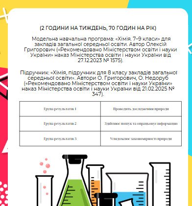 Навчальна програма з Хімії. 8 клас. 70 годин. НУШ. За підручником Григорович О., Недоруб О. та мо...