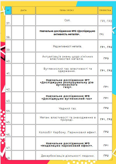 Календарно-тематичне планування з Хімії. 8 клас. 70 годин. НУШ. За підручником Григорович О., Нед...
