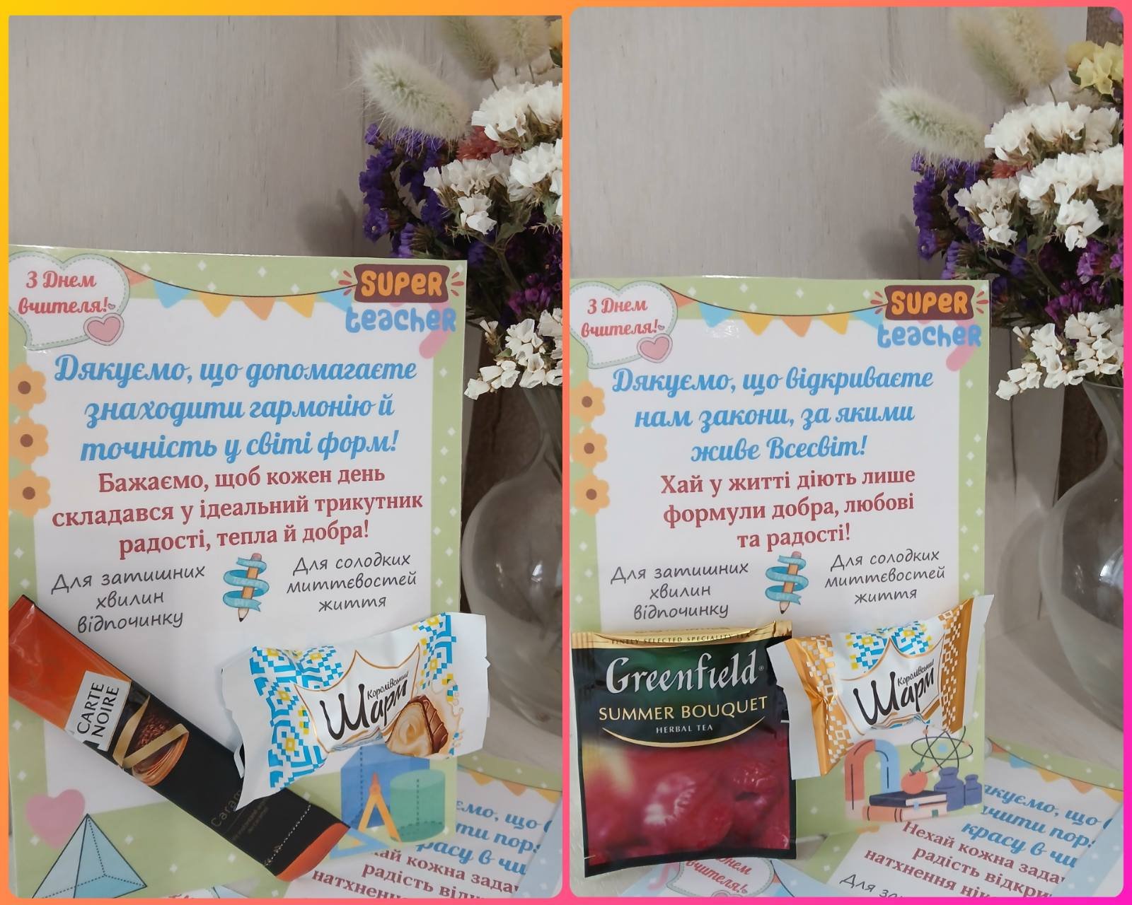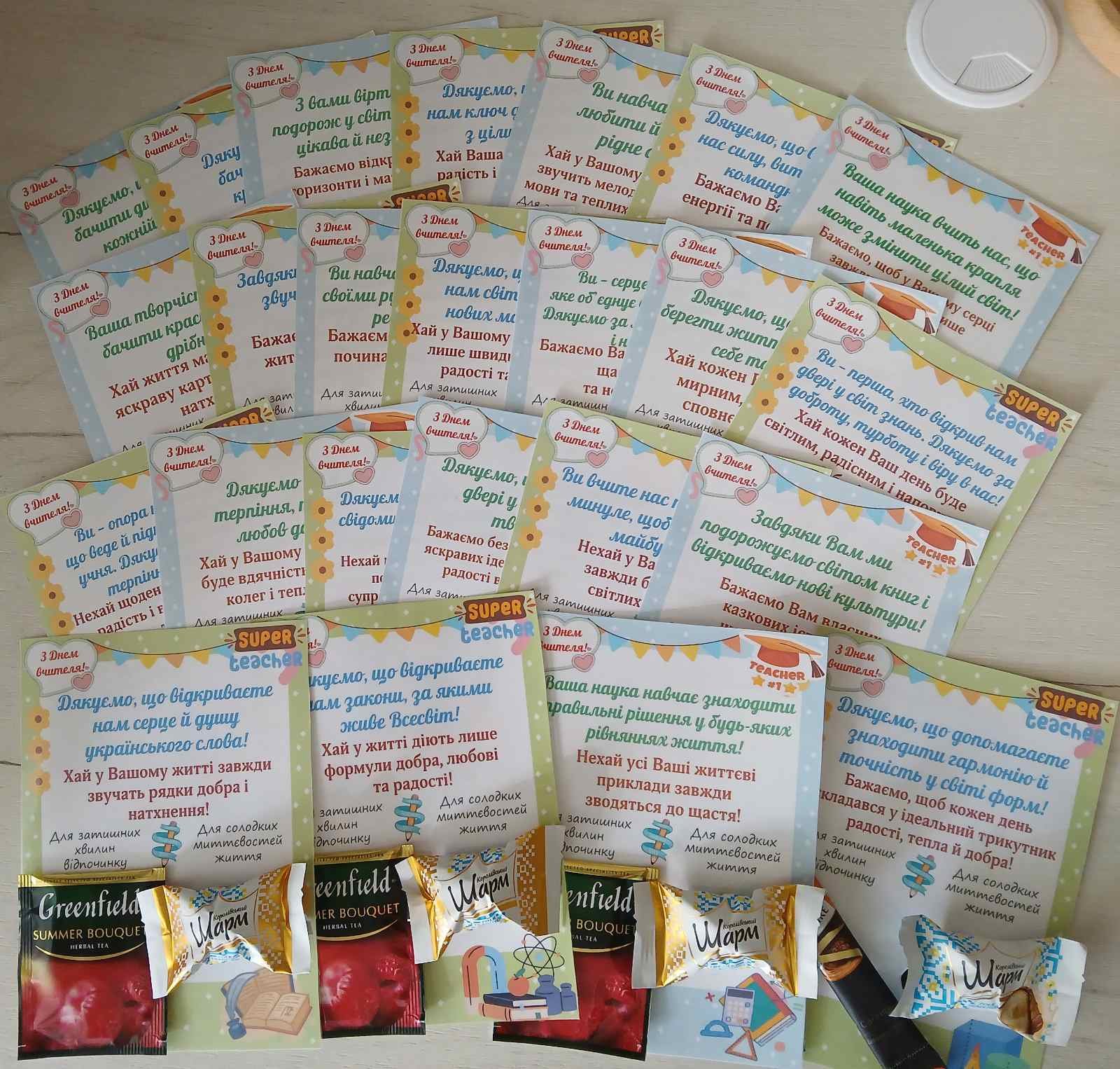 У комплекті представлені листівки з вдячними словами для вчителів різних предметів (біологія, хімія, фізика, географія, геометрія, алгебра, історія, українська та зарубіжна література, іноземна та українська мова, фізична культура, образотворче мистецтво, музичне мистецтво, мистецтво, інформатика, ЗБД, технології, математика, правознавство, директору, класному керівнику, першому вчителю, загальна). Всього 24 листівки, які доповнені місцем для маленького сюрпризу — пакетика чаю (кави) та цукерки. Це створює затишний і приємний презент, який обов’язково подарує гарний настрій вашим колегам.