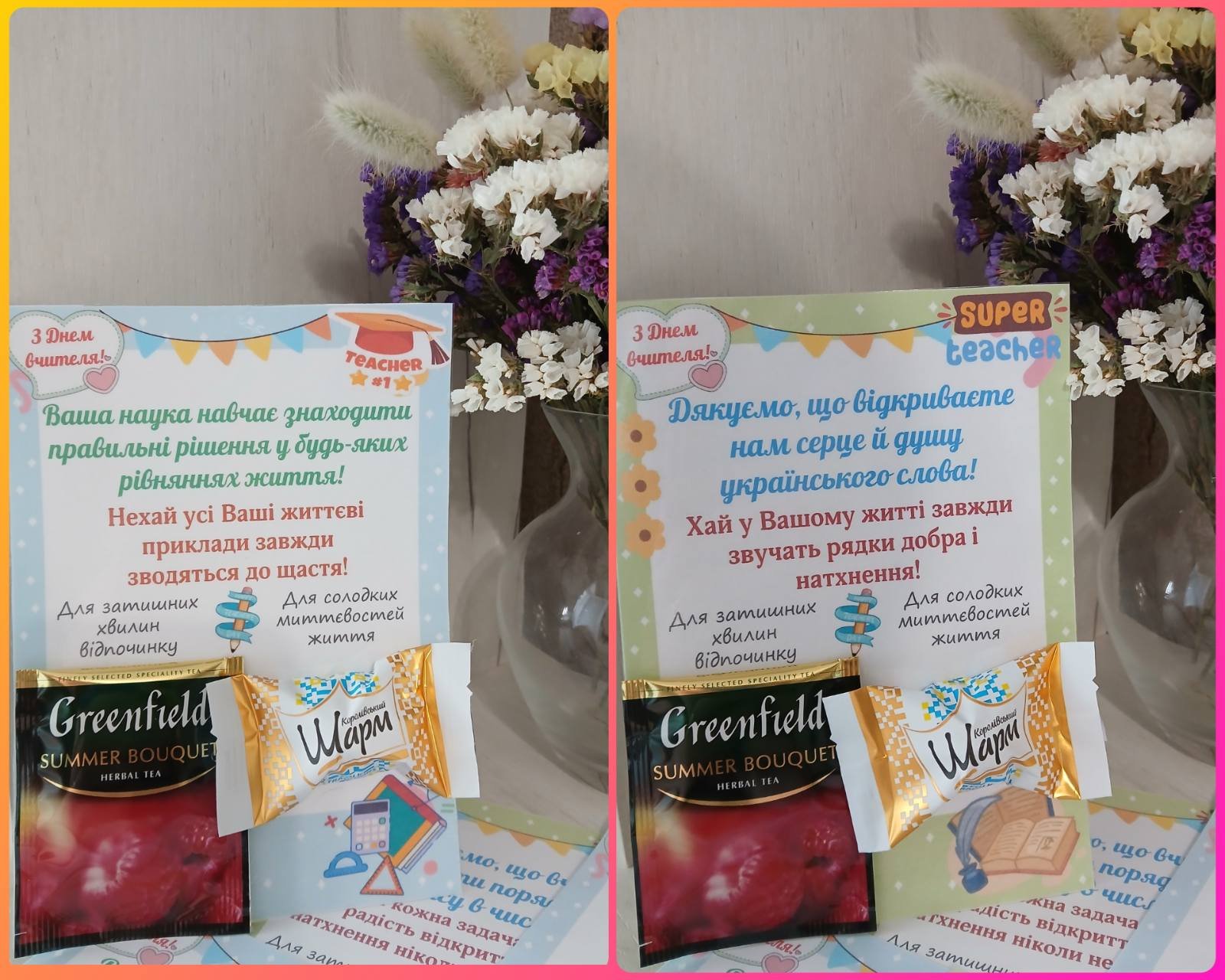 Як купити матеріал «Листівки з привітанням та побажанням з Днем вчителя з місцем для чаю та цукерки. Для вчителів різних предметів.»?