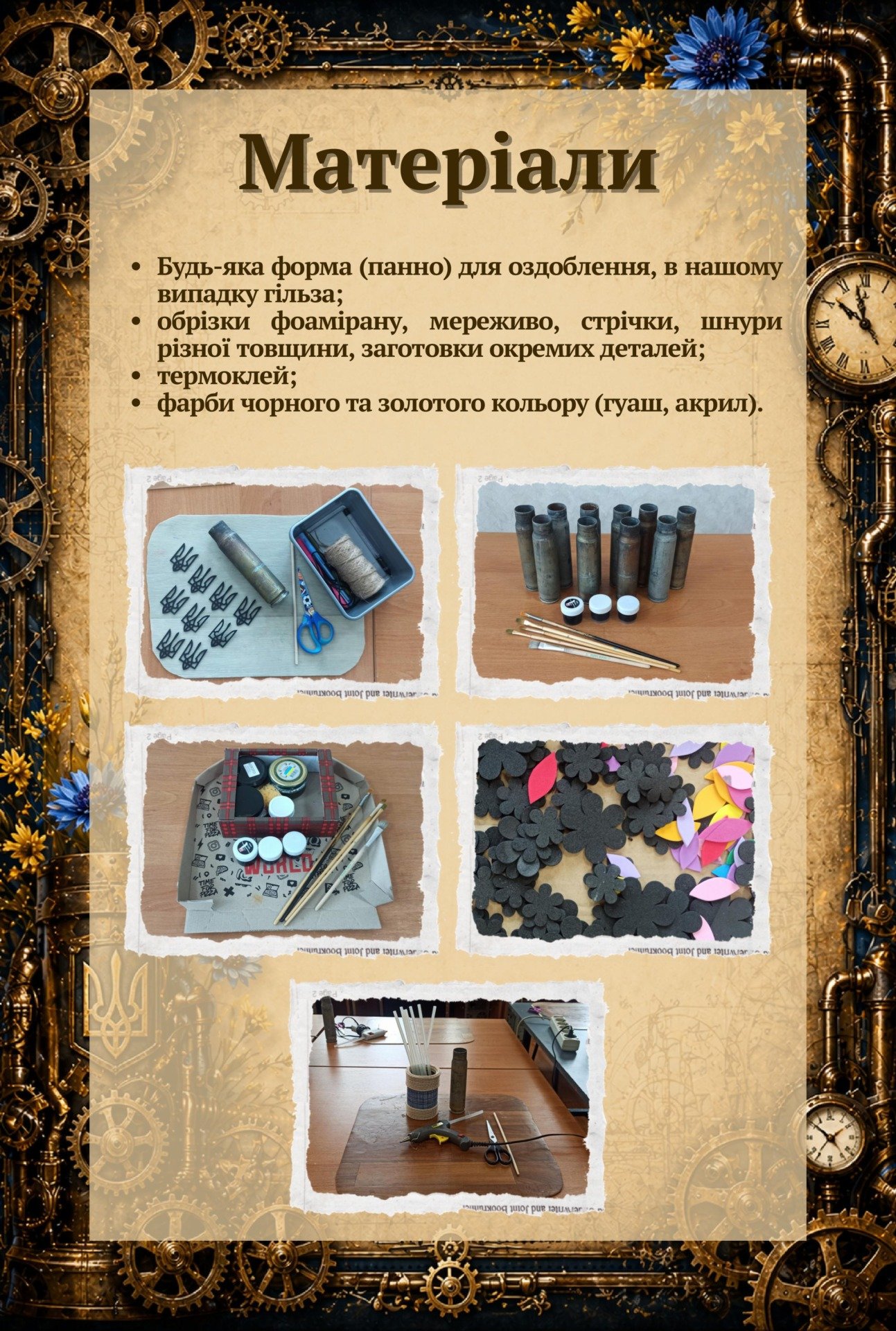 Основа: Відстріляні гільзи, які завдяки творчості «розквітають» патріотичними символами.