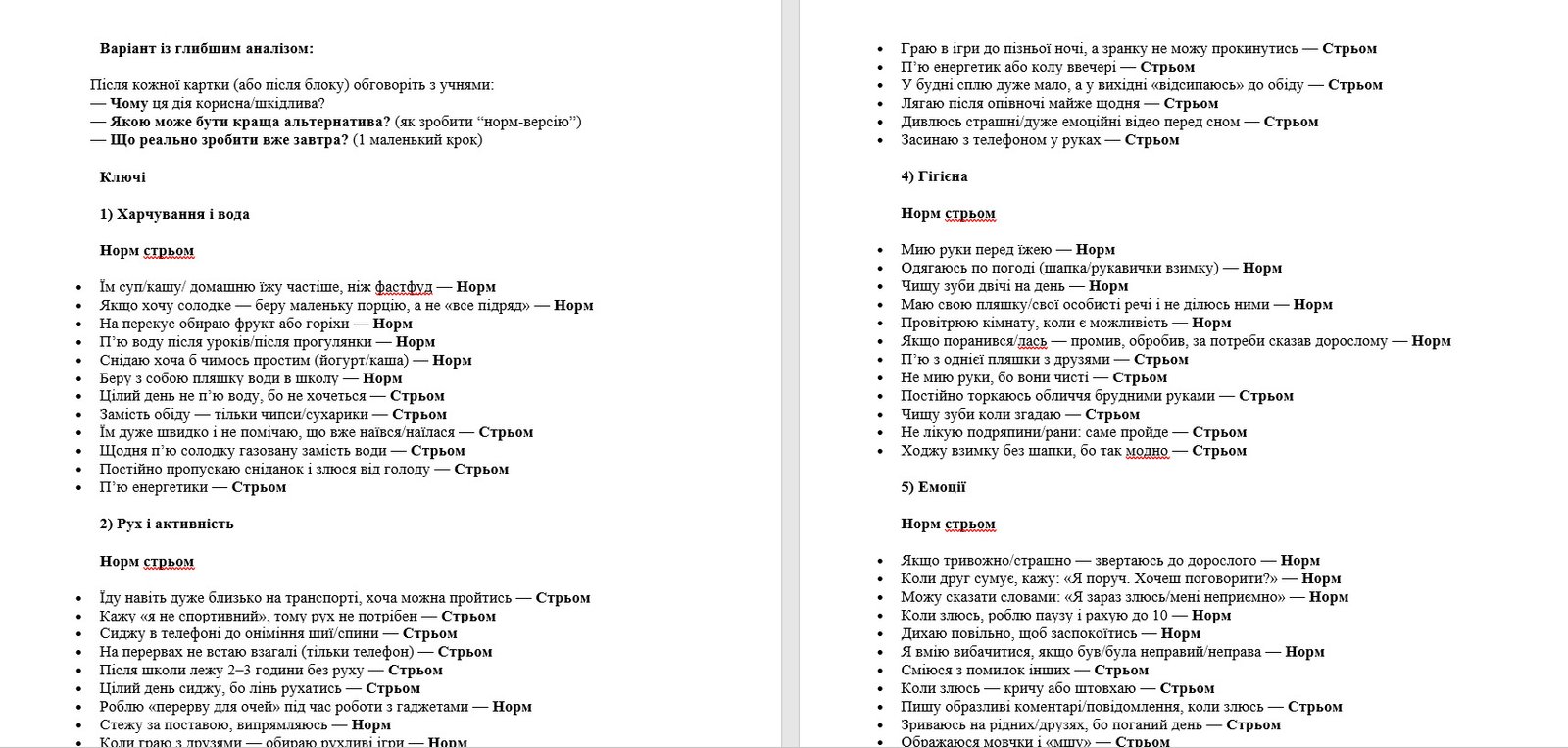 Інтерактивна гра НОРМ/СТРЬОМ “Майстерня здоров’я” допоможе у невимушеному форматі поговорити з дітьми про здорові та шкідливі звички. Учні аналізують різні життєві ситуації та рішення, обираючи, що є «норм» (корисно й безпечно), а що «стрьом» (ризиковано, шкідливо, небезпечно). Гра добре працює на класних годинах, під час тематичних тижнів здоров’я, днів безпеки, виховних заходів, тренінгів.