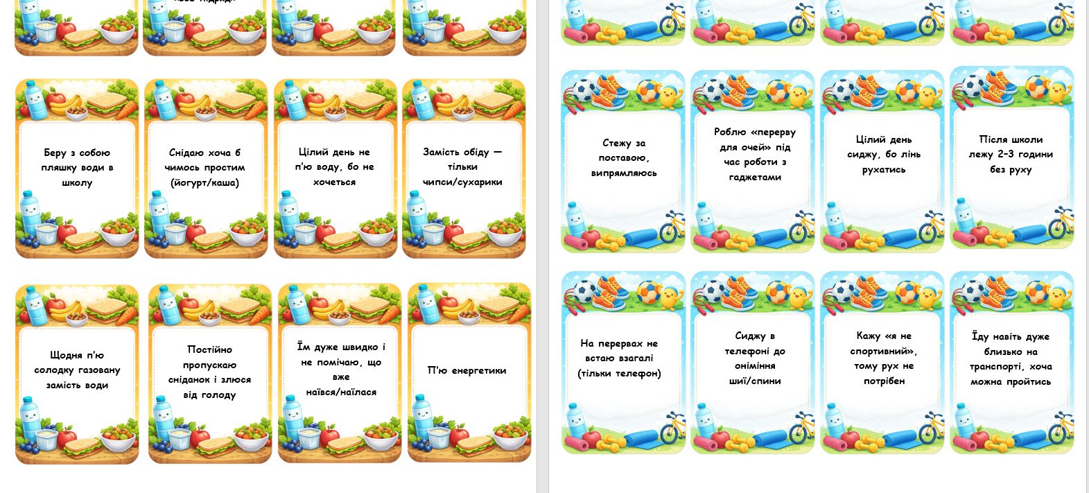 - тематичні кишеньки для 5 блоків (харчування, рух, сон, гігієна, емоції) — можна використовувати для організації станцій або сортування карток;