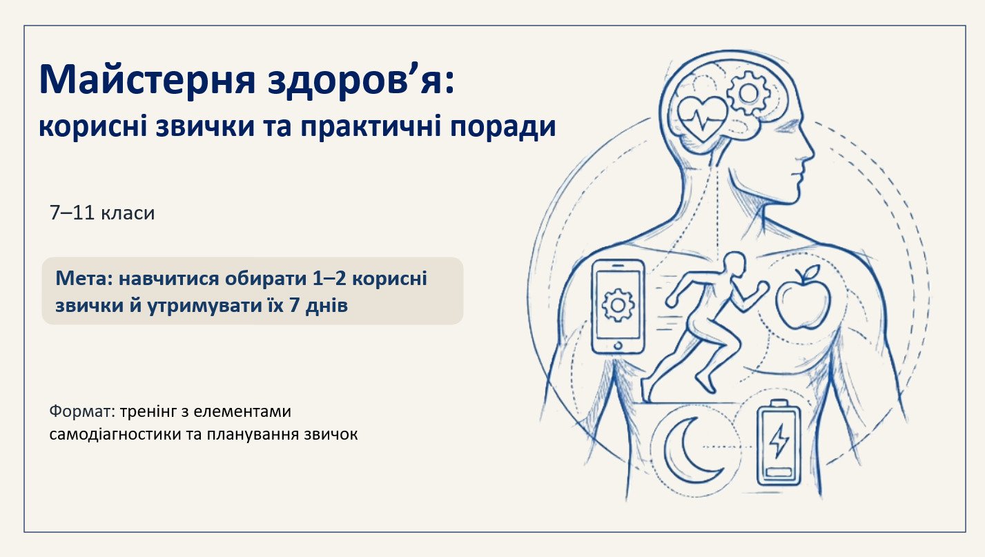 «Майстерня здоров’я: корисні звички та практичні поради» — готовий матеріал для проведення заняття у форматі тренінгу з елементами самодіагностики та планування звичок (7–11 класи).