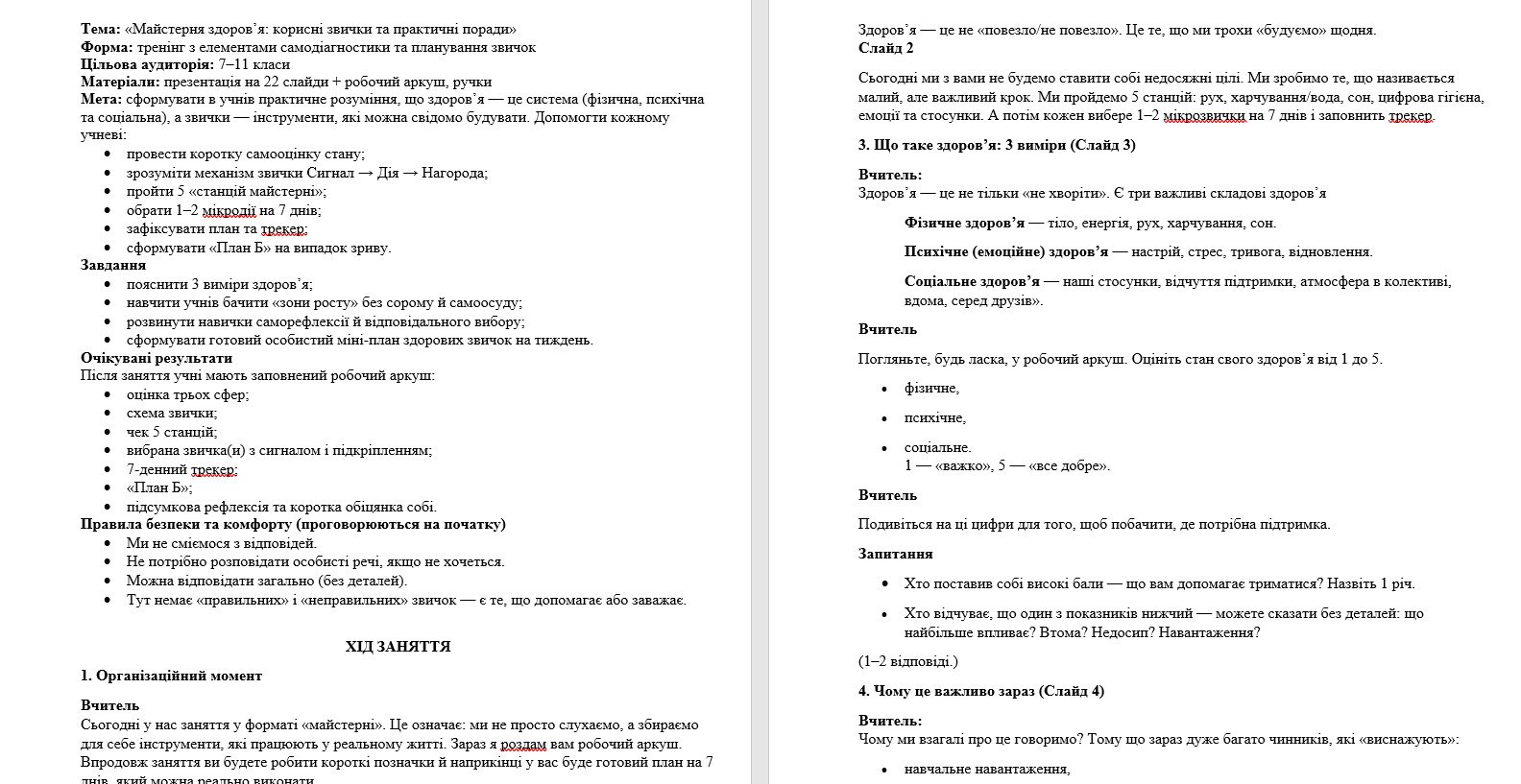 - конспект заняття для вчителя (покроковий хід, репліки, інструкції);