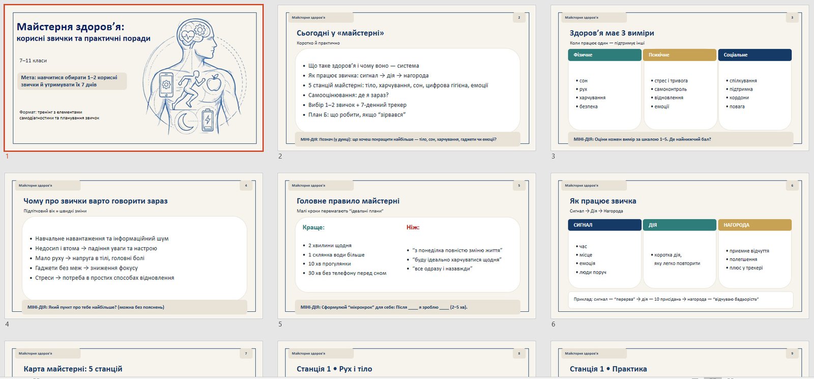 - 5 “станцій майстерні”: рух, харчування/вода, сон, цифрова гігієна, емоції та стосунки;