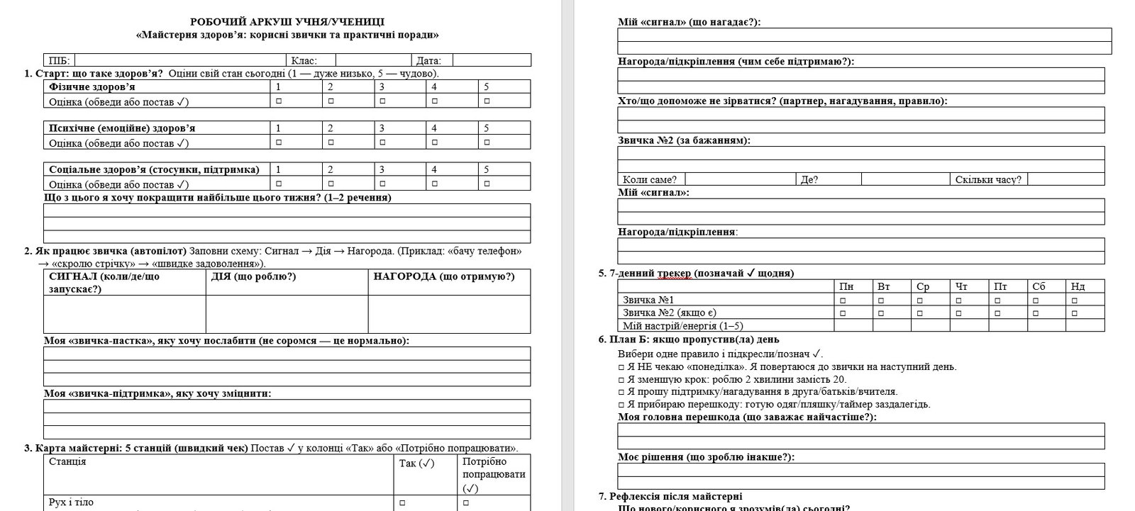 Після заняття учні матимуть заповнений робочий аркуш: оцінка 3 сфер здоров’я, схема звички, чек 5 станцій, план 1–2 мікродій на тиждень, трекер, «План Б» і рефлексія.
