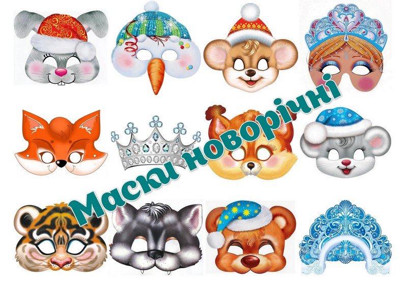 Новорічні маски для дошкільнят і школярів — яскраві, святкові, зручні для друку та вирізання.