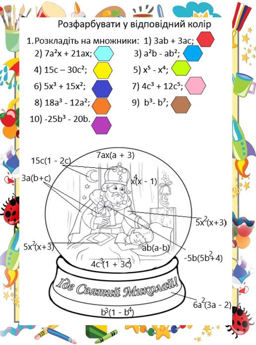 Математичні розмальовки для 7 класу алгебра тема “Винесення спільного множника за дужки” (дві)