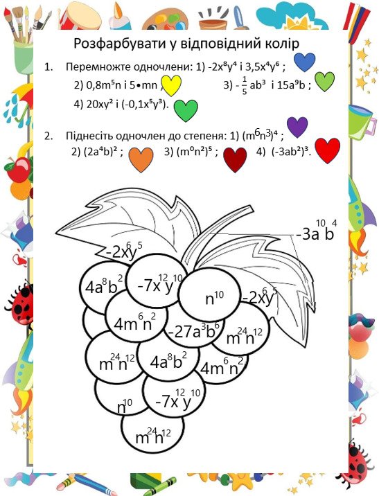 Математичні розмальовки для 7 класу алгебра тема “Вирази. Одночлен. Степінь” (дві))