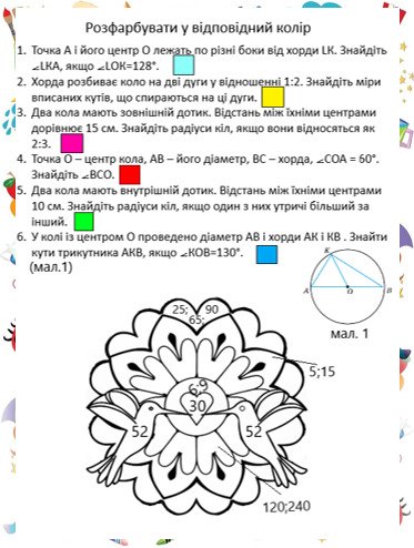 Математичні розмальовки для 7 класу геометрія тема “Коло, круг” (дві)