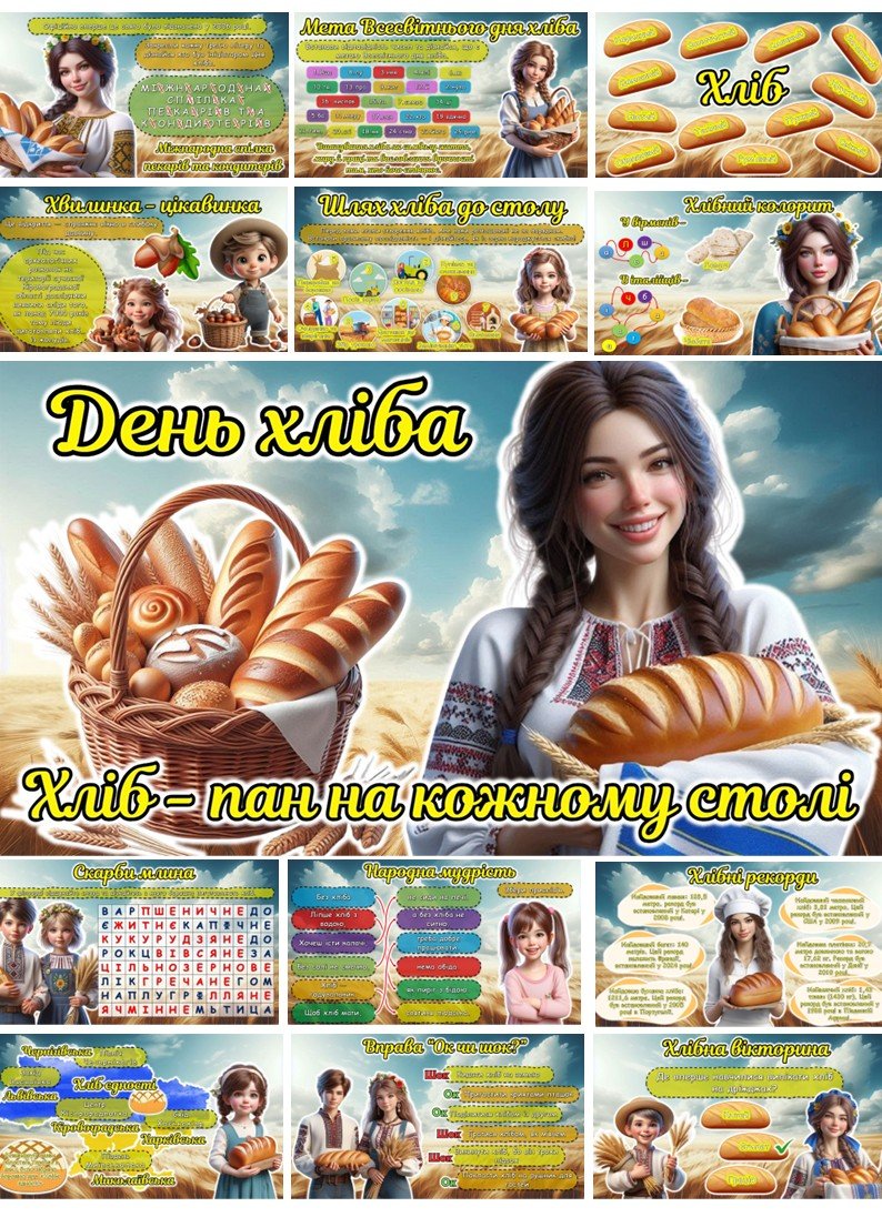 Щоб купити «Мегазбірка до 16 жовтня – Всесвітнього дня хліба. “Хліб – пан на кожному столі” Презентація + розтяжка + конспект + роздатковий + постер + оформлення», потрібно додати матеріал до кошика та оплатити замовлення.