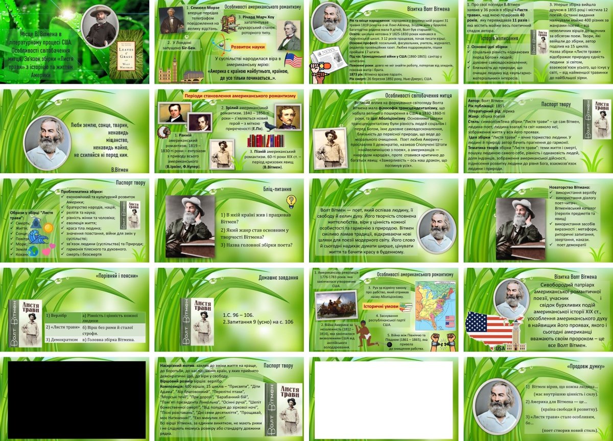 Коли я отримаю матеріал «Місце В. Вітмена в літературному процесі США. Особливості світобачення митця. Зв’язок збірки «Листя трави» з історією та життям Америки»?