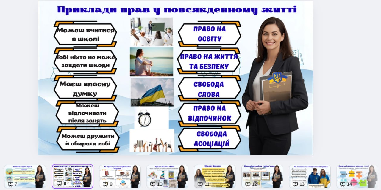 Для учнів 5–11 класів підготовлено сучасну та інформативну презентацію до Міжнародного дня прав людини. Матеріал містить історію виникнення прав людини, ключові факти, перелік основних прав і свобод, приклади їх реалізації в Україні та світі, а також практичні завдання й ситуаційні кейси для критичного мислення.