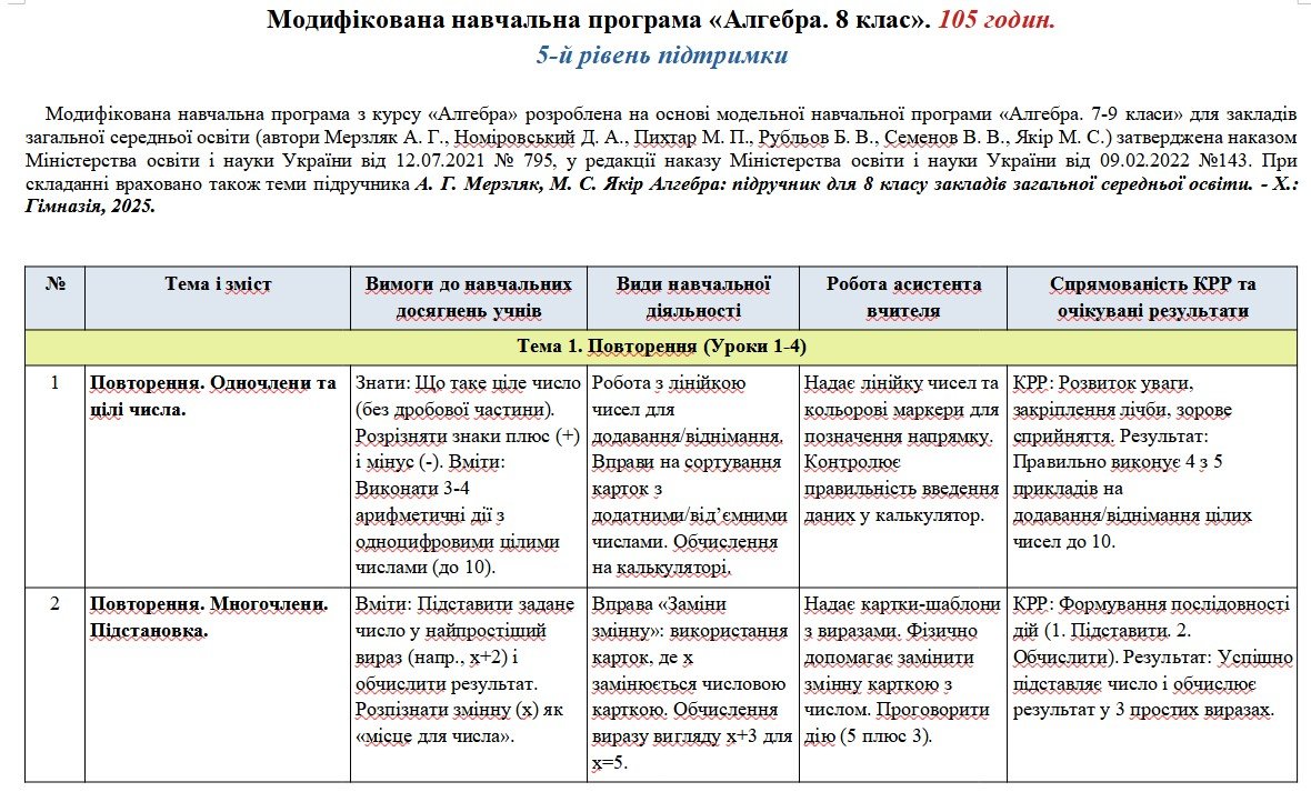 Модифікована навчальна програма з курсу «Алгебра» розроблена на основі модельної навчальної програми «Алгебра. 7-9 класи» для закладів загальної середньої освіти (автори Мерзляк А. Г., Номіровський Д. А., Пихтар М. П., Рубльов Б. В., Семенов В. В., Якір М. С.) затверджена наказом Міністерства освіти і науки України від 12.07.2021 № 795, у редакції наказу Міністерства освіти і науки України від 09.02.2022 №143. При складанні враховано також теми підручника А. Г. Мерзляк, М. С. Якір Алгебра: підручник для 8 класу закладів загальної середньої освіти. – Х.: Гімназія, 2025.