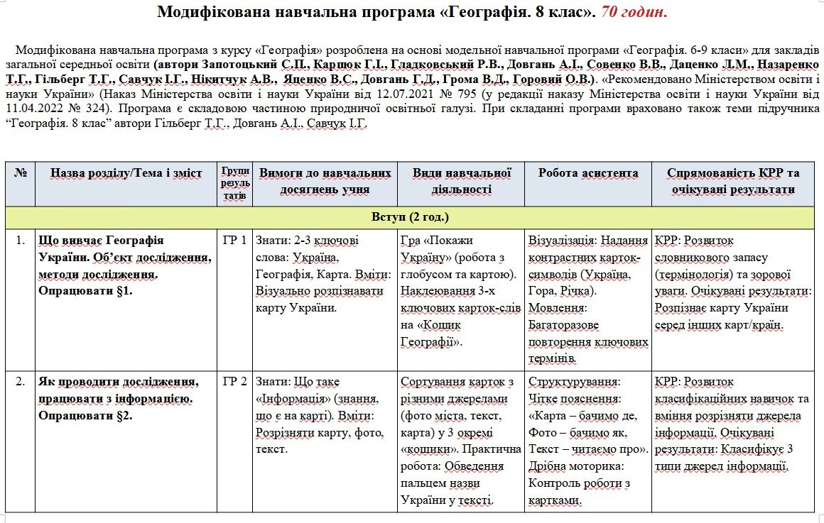 Модифікована навчальна програма з курсу «Географія» розроблена на основі модельної навчальної програми «Географія. 6-9 класи» для закладів загальної середньої освіти (автори Запотоцький С.П., Карпюк Г.І., Гладковський Р.В., Довгань А.І., Совенко В.В., Даценко Л.М., Назаренко Т.Г., Гільберг Т.Г., Савчук І.Г., Нікитчук А.В., Яценко В.С., Довгань Г.Д., Грома В.Д., Горовий О.В.). «Рекомендовано Міністерством освіти і науки України» (Наказ Міністерства освіти і науки України від 12.07.2021 № 795 (у редакції наказу Міністерства освіти і науки України від 11.04.2022 № 324). Програма є складовою частиною природничої освітньої галузі.При складанні програми враховано також теми підручника “Географія. 8 клас” автори Гільберг Т.Г., Довгань А.І., Савчук І.Г.