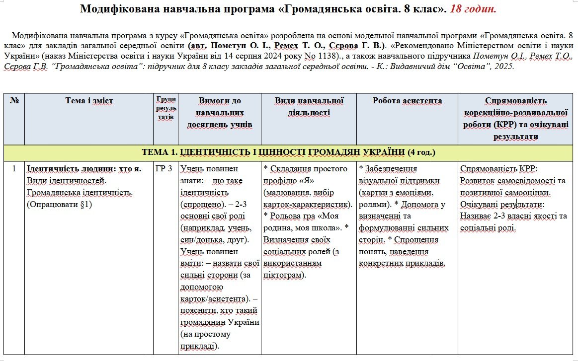 Навчальна програма з курсу «Громадянська освіта” на 2025-2026 н. р. 8 клас. 18 годин. НУШ. ...