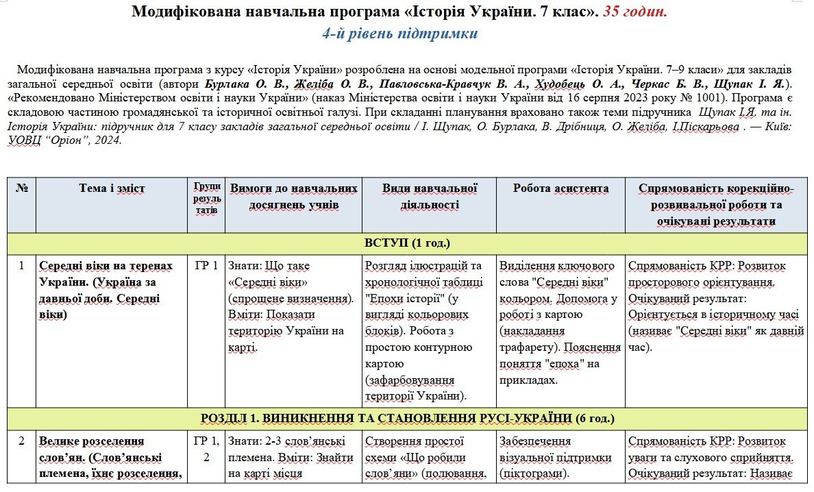 Модифікована навчальна програма з курсу «Історія України» розроблена на основі модельної програми «Історія України. 7–9 класи» для закладів загальної середньої освіти (автори Бурлака О. В., Желіба О. В., Павловська-Кравчук В. А., Худобець О. А., Черкас Б. В., Щупак І. Я.). «Рекомендовано Міністерством освіти і науки України» (наказ Міністерства освіти і науки України від 16 серпня 2023 року № 1001). Програма є складовою частиною громадянської та історичної освітньої галузі. При складанні планування враховано також теми підручника Щупак І.Я. та ін. Історія України: підручник для 7 класу закладів загальної середньої освіти / І. Щупак, О. Бурлака, В. Дрібниця, О. Желіба, І.Піскарьова . — Київ: УОВЦ “Оріон”, 2024.