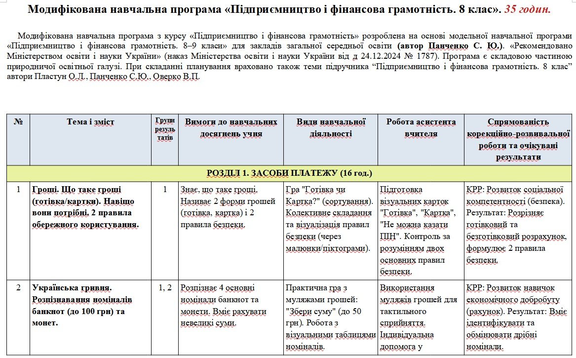 Модифікована навчальна програма з курсу «Підприємництво і фінансова грамотність» розроблена на основі модельної навчальної програми «Підприємництво і фінансова грамотність. 8–9 класи» для закладів загальної середньої освіти (автор Панченко С. Ю.). «Рекомендовано Міністерством освіти і науки України» (наказ Міністерства освіти і науки України від д 24.12.2024 № 1787). Програма є складовою частиною природничої освітньої галузі. При складанні планування враховано також теми підручника “Підприємництво і фінансова грамотність. 8 клас” автори Пластун О.Л., Панченко С.Ю., Оверко В.П.