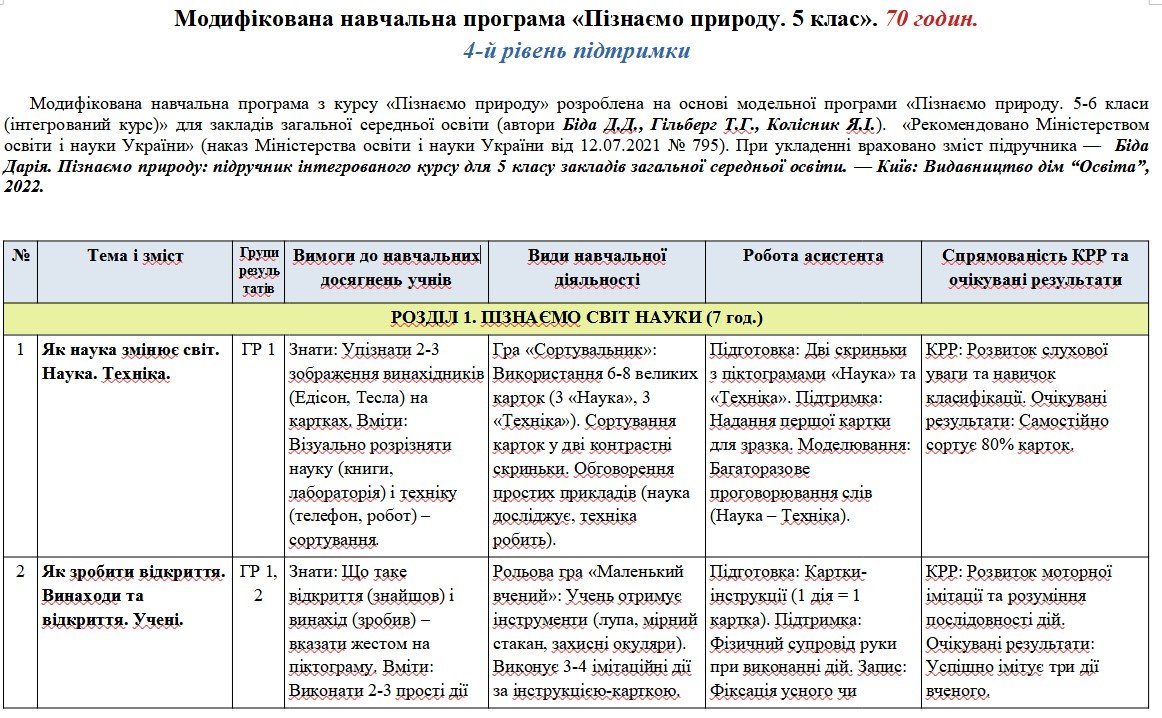Модифікована навчальна програма «Пізнаємо природу. 5 клас». 70 годин. 4-й рівень підтримки. Модифікована навчальна програма з курсу «Пізнаємо природу» розроблена на основі модельної програми «Пізнаємо природу. 5-6 класи (інтегрований курс)» для закладів загальної середньої освіти (автори Біда Д.Д., Гільберг Т.Г., Колісник Я.І.). «Рекомендовано Міністерством освіти і науки України» (наказ Міністерства освіти і науки України від 12.07.2021 № 795). При укладенні враховано зміст підручника — Біда Дарія. Пізнаємо природу: підручник інтегрованого курсу для 5 класу закладів загальної середньої освіти. — Київ: Видавництво дім “Освіта”, 2022.