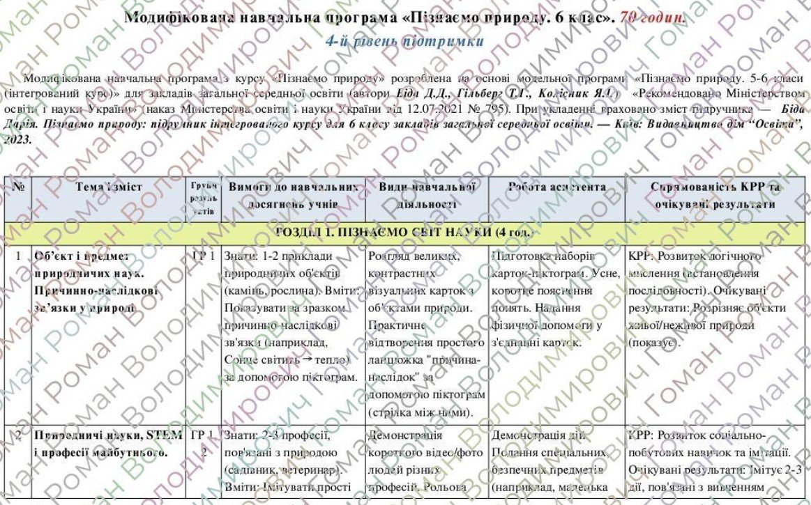 Модифікована навчальна програма «Пізнаємо природу. 6 клас». 70 годин. 4-й рівень підтримки. Модифікована навчальна програма з курсу «Пізнаємо природу» розроблена на основі модельної програми «Пізнаємо природу. 5-6 класи (інтегрований курс)» для закладів загальної середньої освіти (автори Біда Д.Д., Гільберг Т.Г., Колісник Я.І.). «Рекомендовано Міністерством освіти і науки України» (наказ Міністерства освіти і науки України від 12.07.2021 № 795). При укладенні враховано зміст підручника — Біда Дарія. Пізнаємо природу: підручник інтегрованого курсу для 6 класу закладів загальної середньої освіти. — Київ: Видавництво дім “Освіта”, 2023.