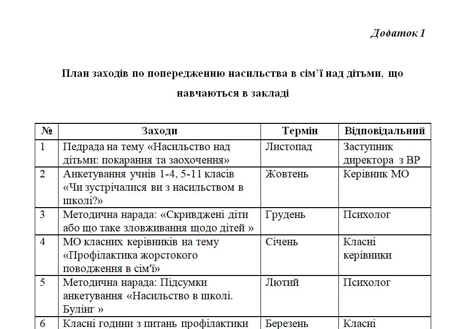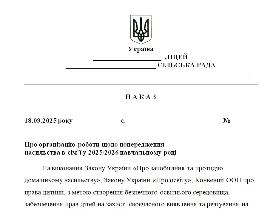 На виконання Закону України «Про запобігання та протидію домашньому насильству», Закону України «Про освіту», Конвенції ООН про права дитини, з метою створення безпечного освітнього середовища, забезпечення прав дітей на захист,