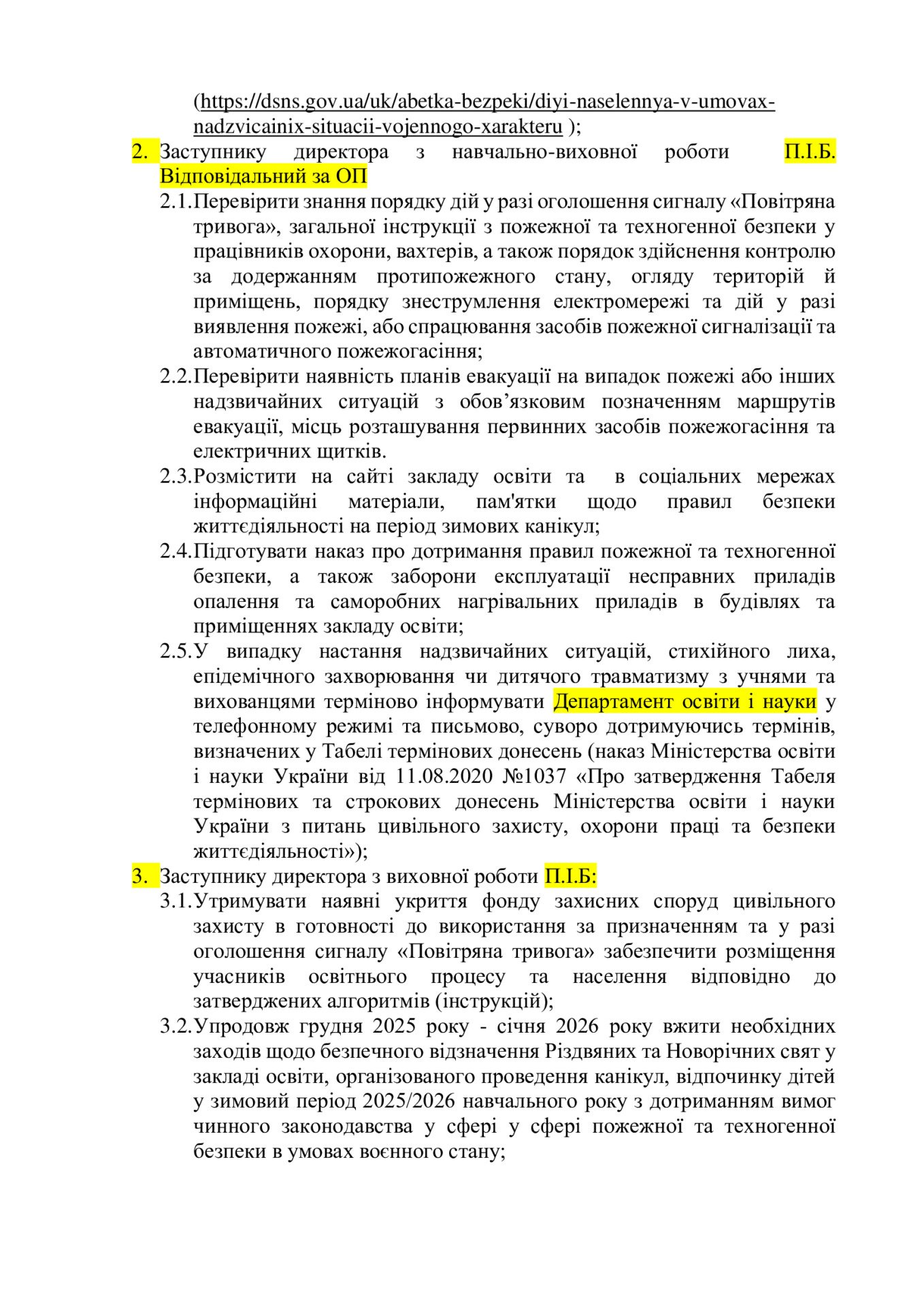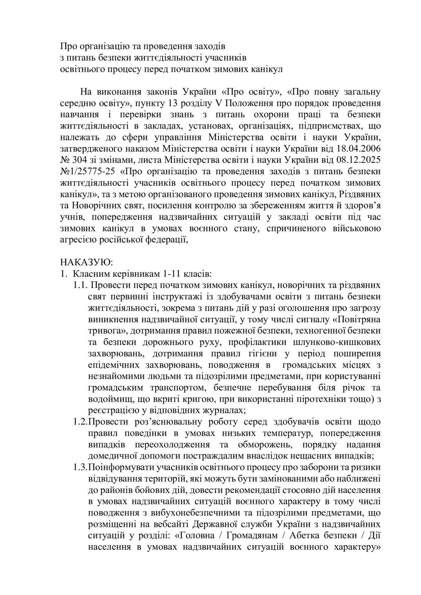 На виконання законів України «Про освіту», «Про повну загальну середню освіту», пункту 13 розділу V Положення про порядок проведення навчання і перевірки знань з питань охорони праці та безпеки життєдіяльності в закладах, установах, організаціях, підприємствах, що належать до сфери управління Міністерства освіти і науки України, затвердженого наказом Міністерства освіти і науки України від 18.04.2006 № 304 зі змінами, листа Міністерства освіти і науки України від 08.12.2025 №1/25775-25 «Про організацію та проведення заходів з питань безпеки життєдіяльності учасників освітнього процесу перед початком зимових канікул»
