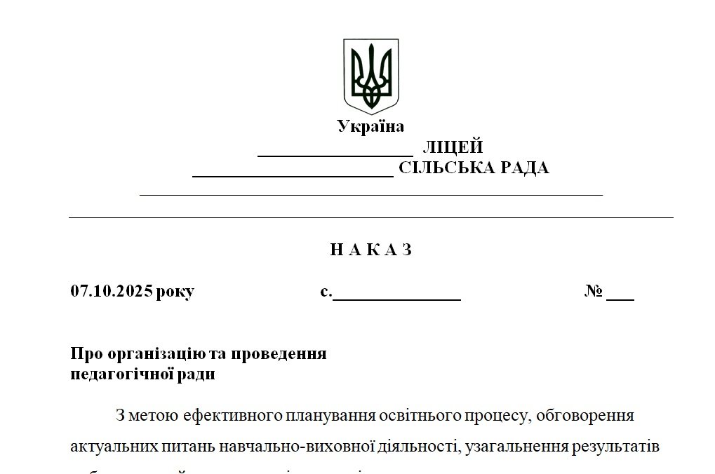 Матеріали «Наказ “Про організацію та проведення жовтневої педагогічної ради”» будуть надіслані в електронному вигляді на вашу поштову скриньку одразу після оплати.