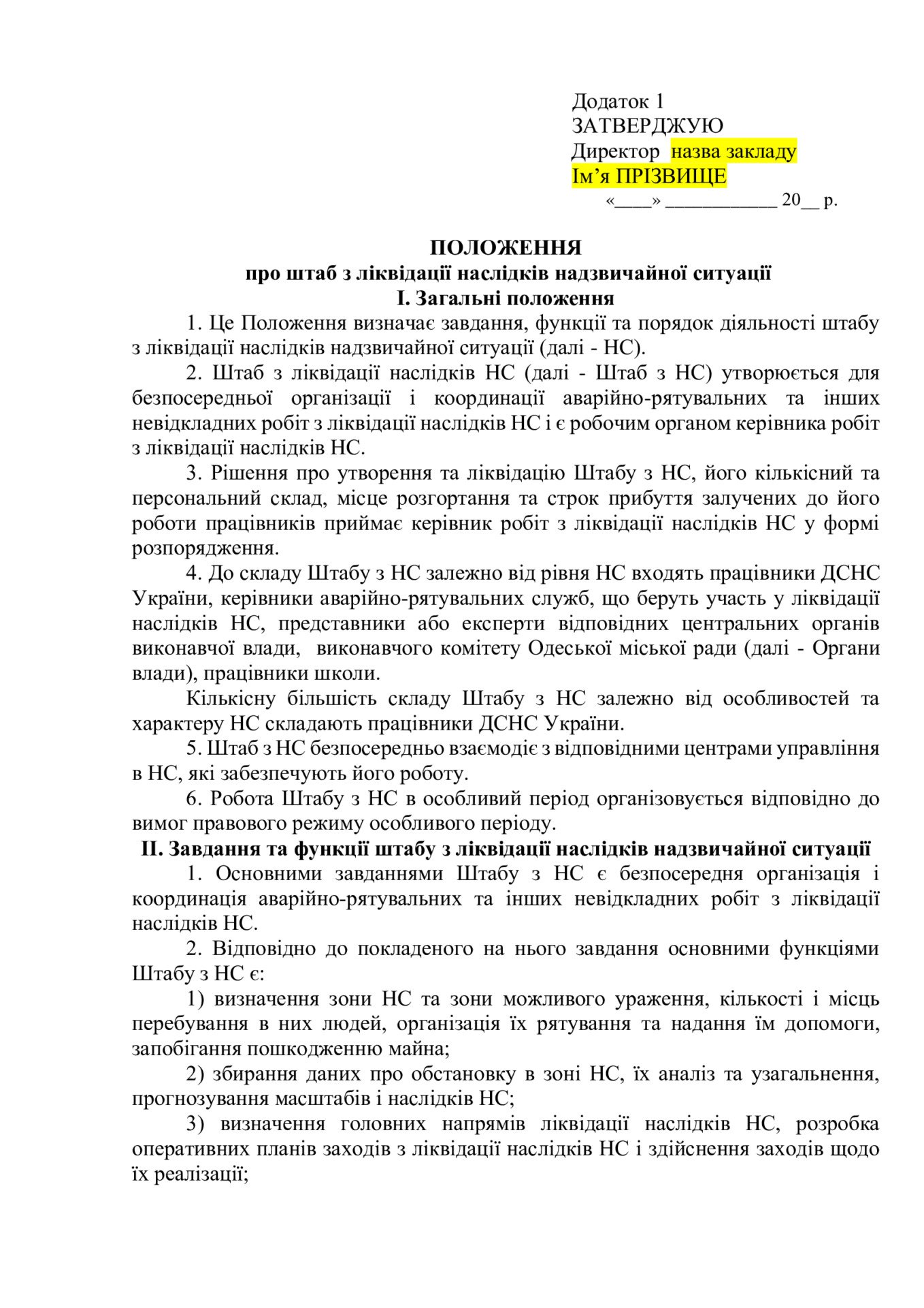 Цей наказ визначає структуру та порядок ведення цивільного захисту (ЦЗ) у навчальному закладі протягом 2026 року. Документом створюється штаб ЦЗ на чолі з директором та затверджується склад невоєнізованих формувань, таких як ланки зв’язку, охорони та пожежогасіння. Основними завданнями визначено оповіщення персоналу, захист від наслідків надзвичайних ситуацій та навчання учнів користуванню засобами індивідуального захисту.