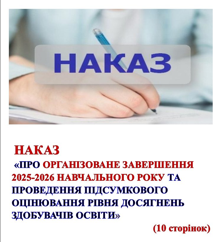 НАКАЗ «ПРО ОРГАНІЗОВАНЕ ЗАВЕРШЕННЯ 2025-2026 НАВЧАЛЬНОГО РОКУ ТА ПРОВЕДЕННЯ ПІДСУМКОВОГО ОЦІНЮВАННЯ РІВНЯ ДОСЯГНЕНЬ ЗДОБУВАЧІВ ОСВІТИ”✍️(10 ст)