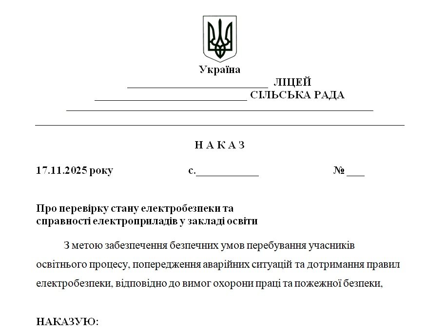 Матеріали «Наказ “Про перевірку стану електробезпеки та справності електроприладів у закладі освіти”» будуть надіслані в електронному вигляді на вашу поштову скриньку одразу після оплати.
