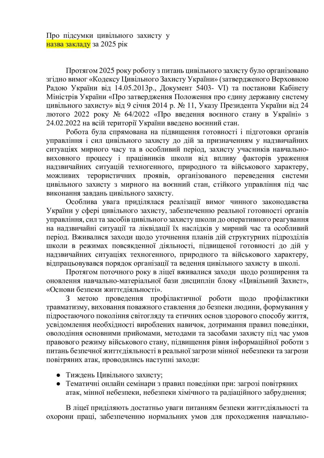 Цей наказ підсумовує результати роботи з цивільного захисту (ЦЗ) у навчальному закладі за 2025 рік, визнаючи її задовільною. Діяльність закладу була спрямована на захист персоналу та учнів в умовах воєнного стану, зокрема через проведення онлайн-семінарів щодо мінної безпеки та дій під час повітряних атак. Протягом року було оновлено навчальну базу та організовано заходи з профілактики травматизму й вивчення правил першої допомоги. Наступні кроки передбачають проведення щоквартальних навчань для працівників та посилення співпраці з ДСНС і Червоним Хрестом. Контроль за виконанням цих завдань залишається за директором ліцею.