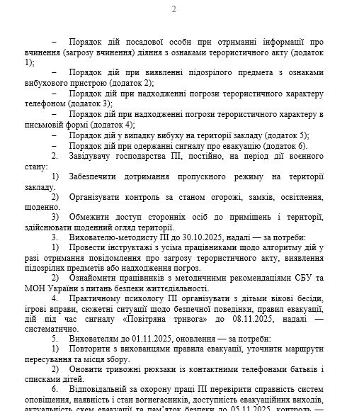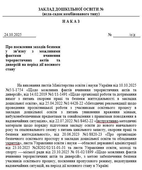 Матеріали «Наказ “Про посилення заходів безпеки у зв’язку з можливими фактами вчинення терористичних актів та диверсій на період дії воєнного стану в ЗДО”» будуть надіслані в електронному вигляді на вашу поштову скриньку одразу після оплати.